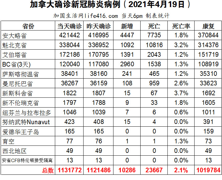 【加国生活网编译报道】截至2021年4月19日下午6点,加拿大新冠确诊病例总数为1131772(3天新增10286,当天新增8326),死亡23667(新增44)。安省确诊总数421442(新增4447);魁省确诊总数338044(新增1092);艾省确诊总数172186(新增1391);BC省确诊总数120040(3天新增2960,当天新增1000);萨省确诊总数38401(新增241);曼省确诊总数36267(新增108)。BC省宣布了一系更严格的旅行限制,将熔断式封锁再延长5周,持续到5月的长周末结束;随着加拿大国家免疫咨询委员更新AstraZeneca疫苗的使用年龄,包括安省和BC省在内的许多省份已将AstraZeneca疫苗的符合资格年龄降低到40岁。加国生活网专门制作了如下统计数据表: