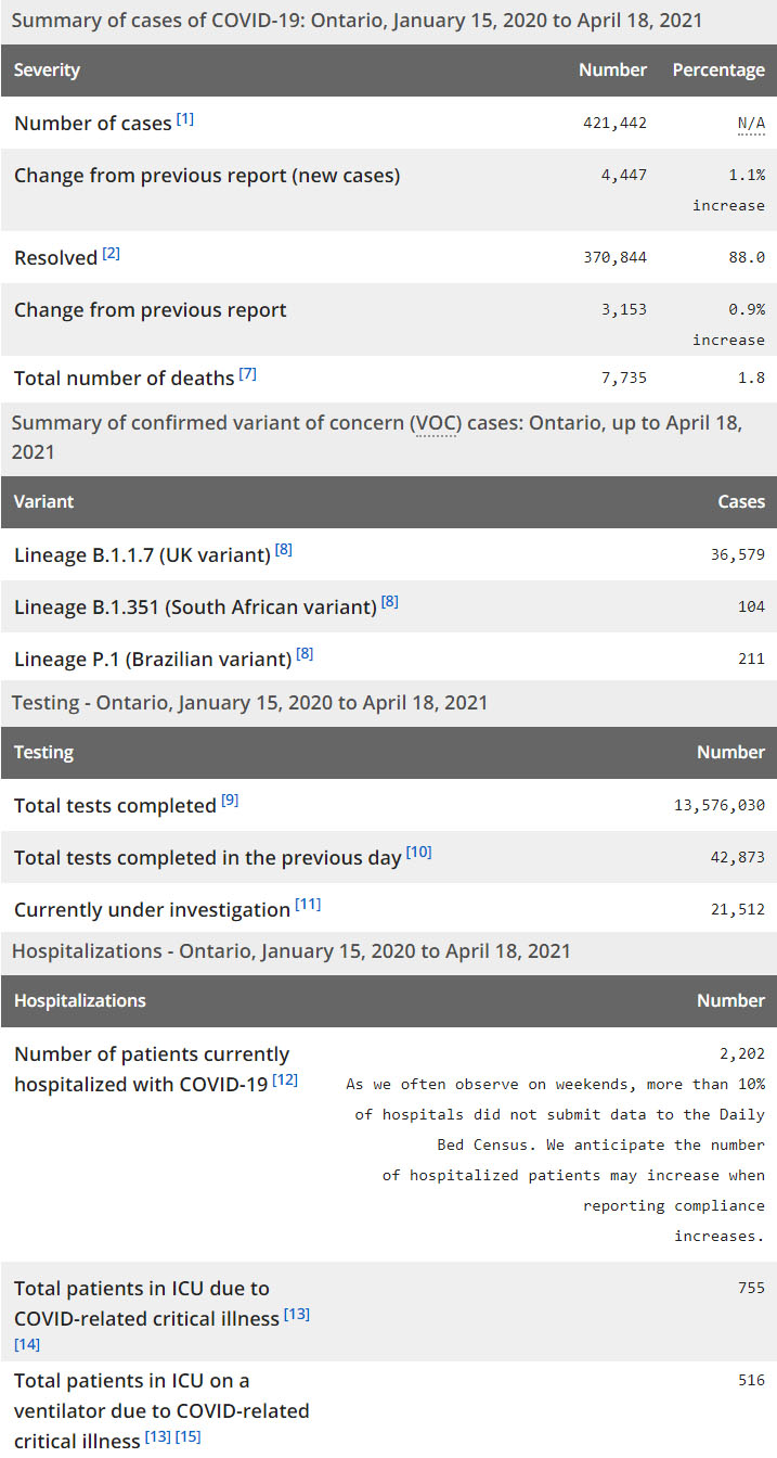 再看看安省方面的详细数据,截止4月18日,安省已对13,576,030例进行了新冠病毒检测(检测数较昨天新增42,873),还有21,512处于被调查阶段。确诊总数421,442(当天新增4447,阳性率上升至10.37%),包括370,844例康复(康复率下降为88.0%)、7,735例死亡(增加19例,死亡率下降为1.8%)。住院患者2202例(增加95,有10%医院未提交数据);进入ICU患者755例(增加14);IU插呼吸机患者516例(增加10)。