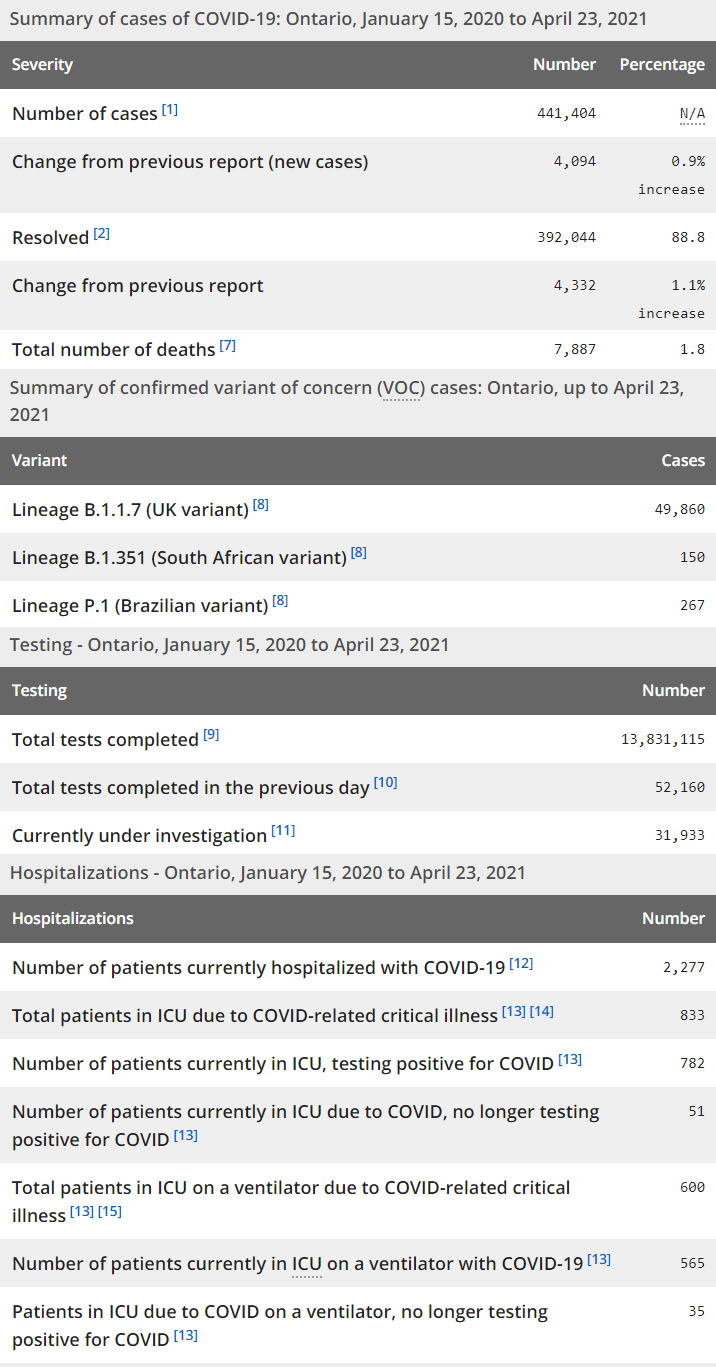 再看看安省方面的详细数据,截止4月23日,安省已对13,831,115例进行了新冠病毒检测(检测数较昨天新增52,160),还有31,933处于被调查阶段。确诊总数441,404(当天新增4094,阳性率下降至7.85%),包括392,044例康复(康复率上升为88.8%)、7,887例死亡(增加24例,死亡率仍为1.8%)。住院患者2277例(减少10);进入ICU患者833例(增加15);IU插呼吸机患者600例(增加7)。