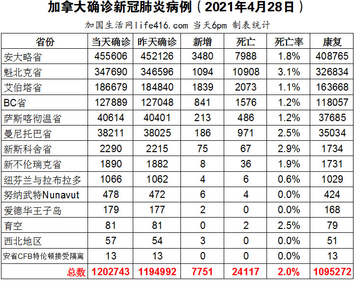 【加国生活网编译报道】截至2021年4月28日下午6点,加拿大新冠确诊病例总数为1202743(新增7751),死亡24117(新增53)。安省确诊总数455606(新增3480);魁省确诊总数347690(新增1094);艾省确诊总数186679(新增1839);BC省确诊总数127889(新增841);萨省确诊总数40614(新增213);曼省确诊总数38211(新增186)。为扩大疫苗接种率,BC省将AstraZeneca疫苗扩大到30岁以下的人群,原因是之前疫情严重北部城市在大规模疫苗接种后,确诊病例下降至3例;安省卫生部将允许医院在未经患者同意的情况下将一些患者转移到长期护理或养老院;虽然安省R值已下降到1以下,但变异病毒病例目前占所有新增确诊病例的95%;安省终于宣布推出省级带薪病假计划。加国生活网专门制作了如下统计数据表: