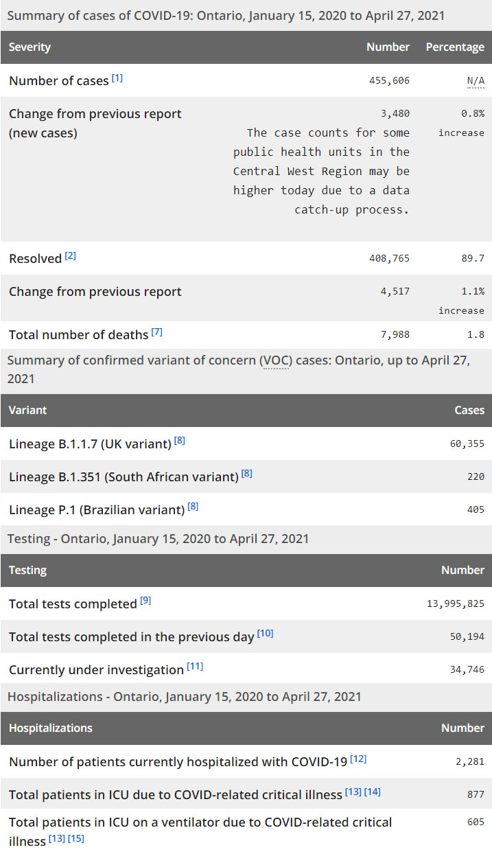 —— 安省在4月28日新增了3,480例确诊病例,这其中多伦多961例(这是自两个半星期以来,多伦多首次报告在1千例以下)、皮尔区589例、约克区290例、达勒姆区221例、渥太华180例、霍尔顿区116例、尼亚加拉大区341例、汉密尔顿255例。七天的平均每日病例下降到3,783,该指标自4月17日触及4,370高点以来,已连续11天下跌。当天还新增24例死亡病例,死亡总数升至7,988。住院患者为2,281例,其中877例在重症监护病房,605例在呼吸机上,这两个数字都是自疫情以来的最高点。