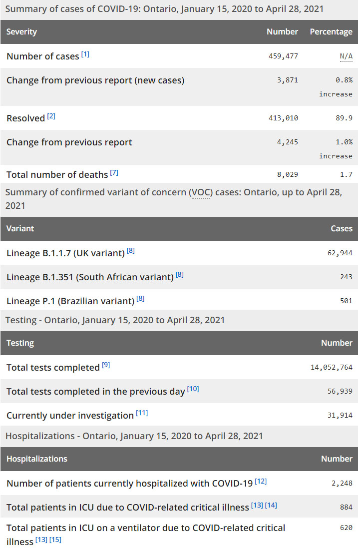 —— 安省在4月29日新增3,871例确诊病例,在新增病例中,多伦多1172例、皮尔区901例、约克区392例、达勒姆区292例。在经过一周的数值下降后,七天的日平均病例数又上升到了3,810。当天还新增41例死亡病例,不仅创自2月19日以来的最高记录,还使死亡总数突破8千例至8029例。另外,有例住院治疗,其中884例在重症病例,620例在呼吸机上。