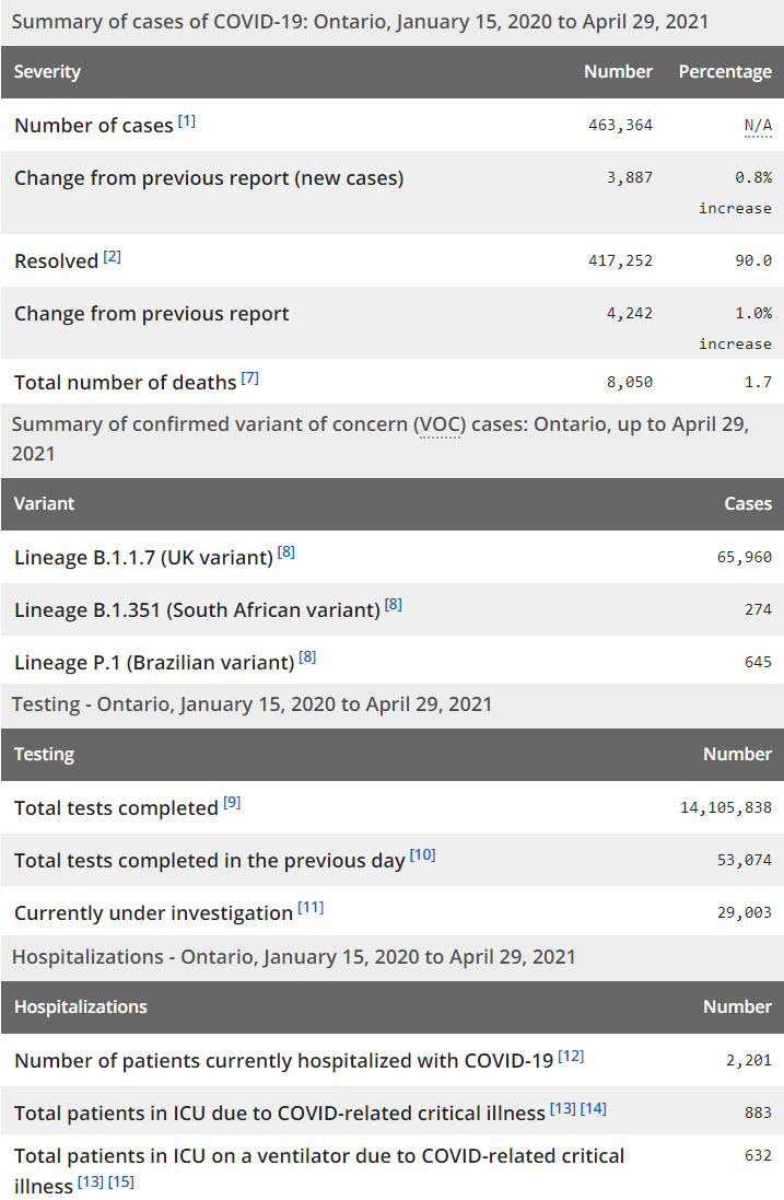 再看看安省方面的详细数据,截止4月29日,安省已对14,105,838例进行了新冠病毒检测(检测数较昨天新增53,074),还有29,003处于被调查阶段。确诊总数463,364(当天新增3887,阳性率下降至7.32%),包括417,252例康复(康复率上升为90.0%)、8050例死亡(增加21例,死亡率仍为1.7%)。住院患者2201例(减少47);进入ICU患者883例(减少1);IU插呼吸机患者632例(增加12)。