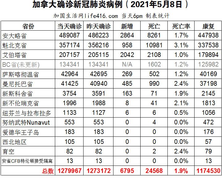 【加国生活网编译报道】截至2021年5月8日下午6点,加拿大新冠确诊病例总数为1279967(新增6795),死亡24568(新增39)。安省确诊总数489087(新增2864);魁省确诊总数357174(新增958);艾省确诊总数207157(新增2042);BC省逢周末不更新;萨省确诊总数42964(新增269);曼省确诊总数41425(新增485);新期科舍省总数3754(新增163)。尽管加拿大仍在“第三波”疫情中,但专家们警告称,如果卫生限制措施解除得太快,“第四波”疫情随时可能发生;安省重症监护病房人数已连续下降了一周;安省已接种了超过六百万剂疫苗;安省近140家药房从5月8日起为热点地区的18岁以上人群接种信使疫苗,其中78家药房接种辉瑞疫苗,58家药房接种Moderna疫苗。加国生活网专门制作了如下统计数据表: