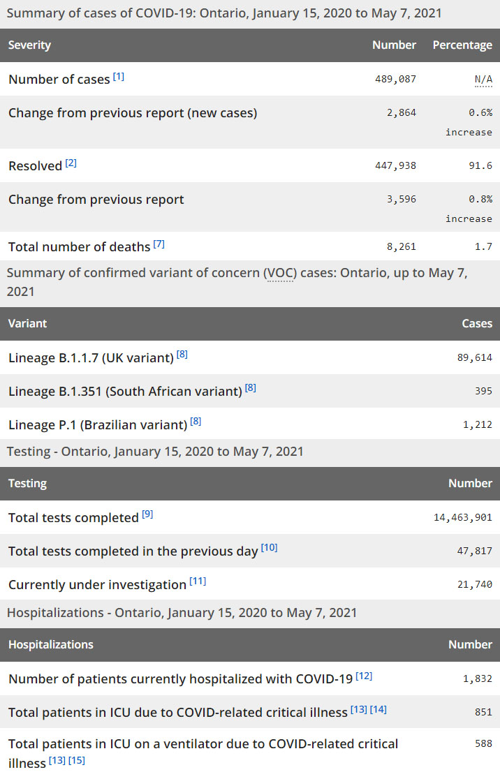 再看看安省方面的详细数据,截止5月7日,安省已对14,463,901例进行了新冠病毒检测(检测数较昨天新增47,817),还有21,740处于被调查阶段。确诊总数489,087(当天新增2,864,阳性率下降至5.99%),包括447,938例康复(康复率上升为91.6%)、8261例死亡(增加25例,死亡率仍为1.7%)。住院患者1832例(减少92);进入ICU患者851例(减少7);IU插呼吸机患者588例(减少23)。