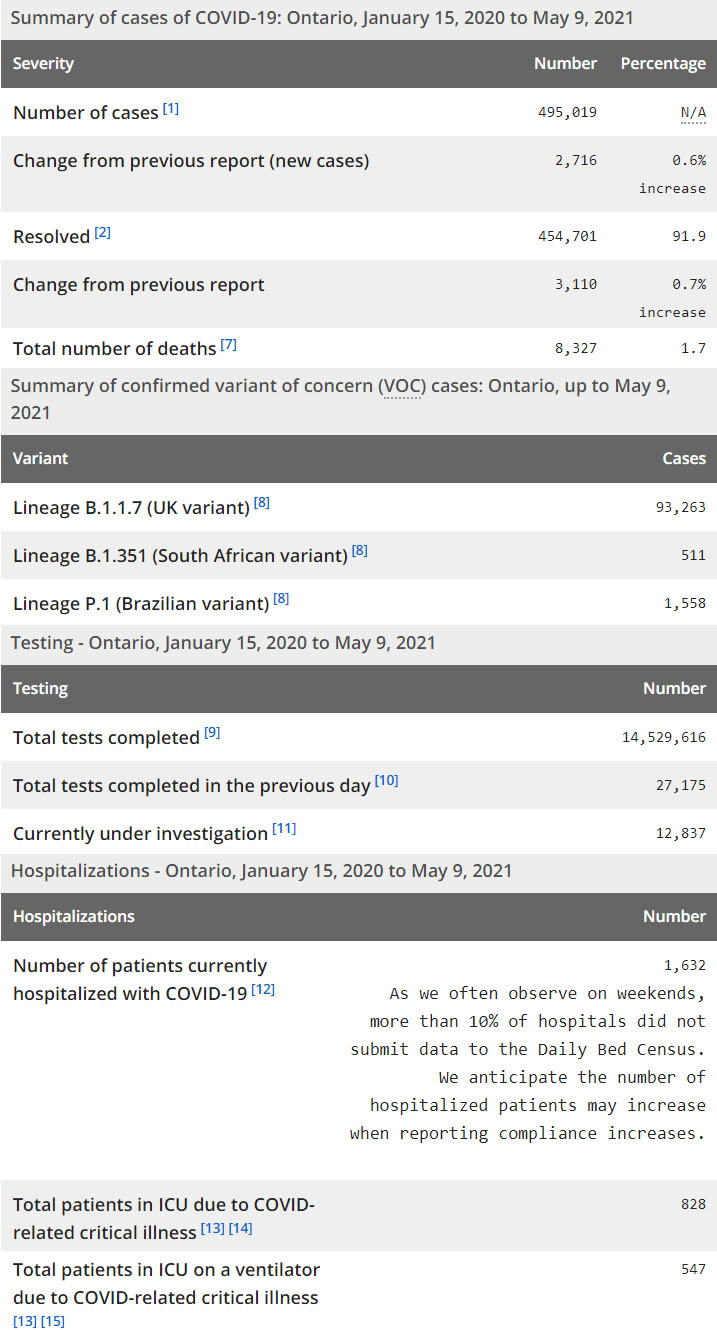 再看看安省方面的详细数据,截止5月9日,安省已对14,529,616例进行了新冠病毒检测(检测数较昨天新增27,175),还有12,837处于被调查阶段。确诊总数495,019(当天新增2716,阳性率上升至9.99%),包括454,701例康复(康复率上升为91.9%)、8327例死亡(增加19例,死亡率仍为1.7%)。住院患者1632例(减少8,周末有10%医院未提交数据);进入ICU患者828例(减少20);IU插呼吸机患者547例(减少33)。