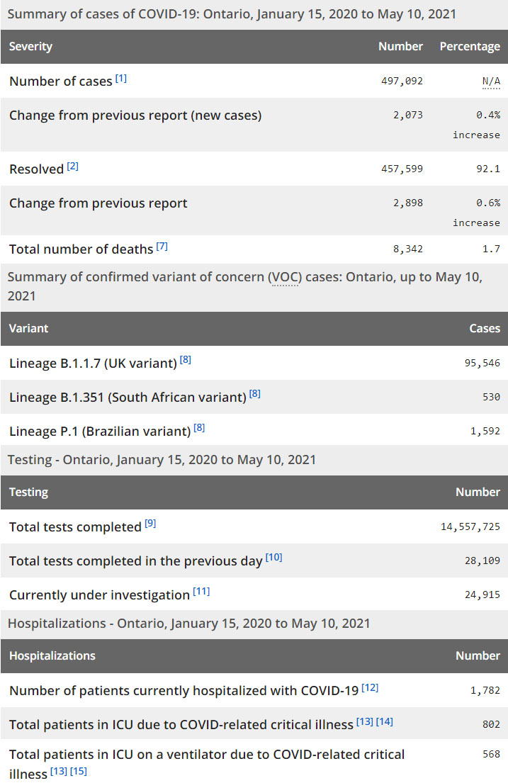 再看看安省方面的详细数据,截止5月10日,安省已对14,557,725例进行了新冠病毒检测(检测数较昨天新增28,109),还有24,915处于被调查阶段。确诊总数497,092(当天新增2073,阳性率下降至7.37%),包括457,599例康复(康复率上升为92.1%)、8342例死亡(增加15例,死亡率仍为1.7%)。住院患者1632例(增加150);进入ICU患者802例(减少26);IU插呼吸机患者568例(增加21)。