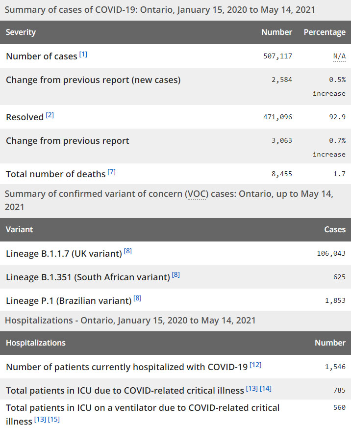 再看看安省方面的详细数据,截止5月14日,安省已对14,737,404例进行了新冠病毒检测(检测数较昨天新增42,320),还有19,533处于被调查阶段。确诊总数507,117(当天新增2,584,阳性率上升至6.11%),包括471,096例康复(康复率上升为92.9%)、8,455例死亡(增加24例,死亡率仍为1.7%)。住院患者1,546例(减少36);进入ICU患者785例(增加8例);IU插呼吸机患者560例(未变)。