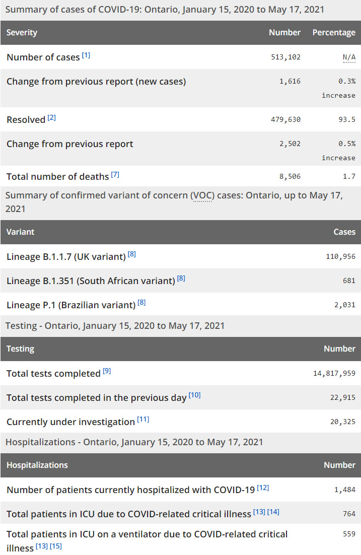 再看看安省方面的详细数据,截止5月17日,安省已对14,817,959例进行了新冠病毒检测(检测数较昨天新增22,915),还有20,325处于被调查阶段。确诊总数513,102(当天新增1,616,阳性率下降至7.05%),包括479,630例康复(康复率上升为93.5%)、8,506例死亡(增加17例,死亡率仍为1.7%)。住院患者1,484例(增加164);进入ICU患者764例(减少15);IU插呼吸机患者559例(增加23例)。