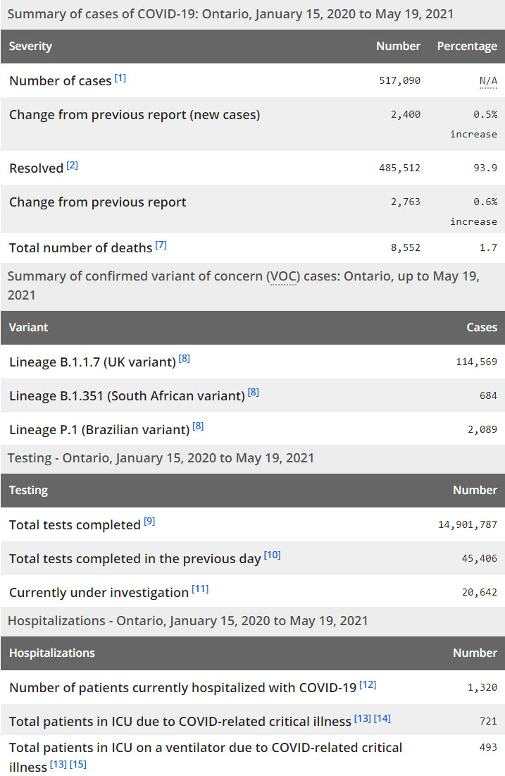 再看看安省方面的详细数据,截止5月19日,安省已对14,901,787例进行了新冠病毒检测(检测数较昨天新增45,406),还有20,642处于被调查阶段。确诊总数517,090(当天新增2,400,阳性率上升至5.29%),包括485,512例康复(康复率上升为93.9%)、8,552例死亡(增加27例,死亡率仍为1.7%)。住院患者1,320例(减少81);进入ICU患者721例(减少14);IU插呼吸机患者493例(减少46)。