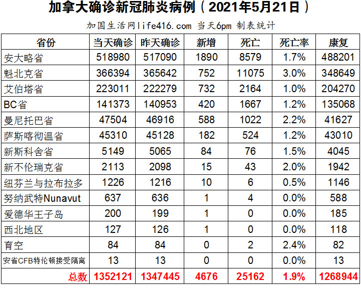 【加国生活网编译报道】截至2021年5月21日下午6点,加拿大新冠确诊病例总数为1352121(新增4676),死亡25162(新增51)。安省确诊总数518980(新增1890);魁省确诊总数366394(新增752);艾省确诊总数223011(新增732);BC省确诊总数141373(新增420);曼省确诊总数47504(新增588);萨省确诊总数45310(新增182)。加拿大已将禁止从印度和巴基斯坦直飞的禁令延长至6月21日;安省12岁及以上青少年从5月23日上午8点开始有资格预约接种疫苗,预订之日必须已经12岁;安省卫生部宣布凡是在3月10日至3月19日之间接种第一剂AstraZeneca的人可以从5月24日起接种第二剂疫苗,二剂时间间隔缩短至10周。加国生活网专门制作了如下统计数据表: