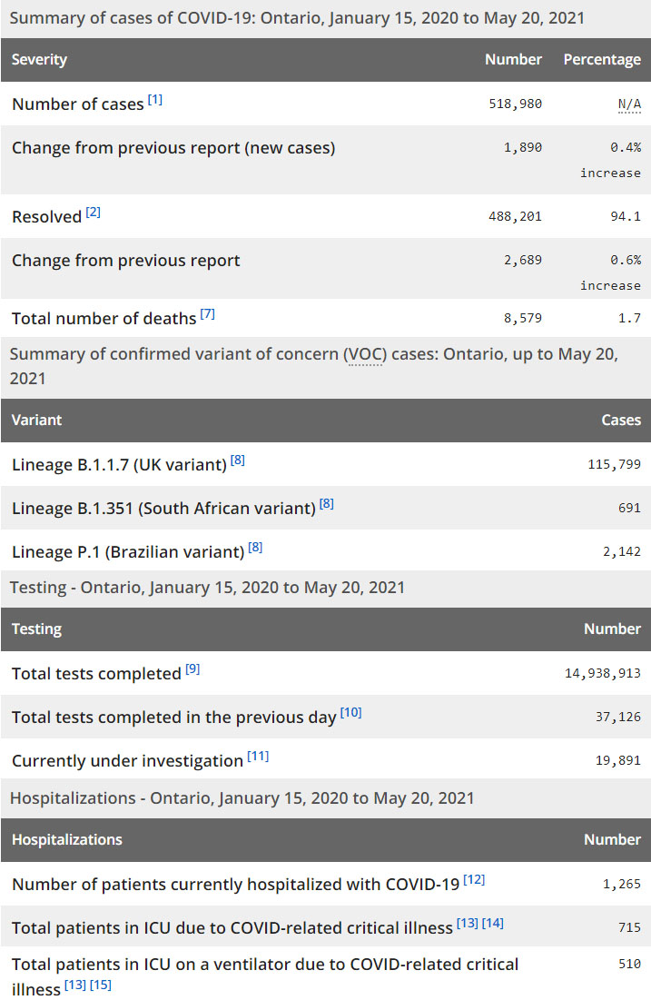 再看看安省方面的详细数据,截止5月20日,安省已对14,938,913例进行了新冠病毒检测(检测数较昨天新增37,126),还有19,891处于被调查阶段。确诊总数518,980(当天新增1,890,阳性率下降至5.09%),包括488,201例康复(康复率上升为94.1%)、8,579例死亡(增加27例,死亡率仍为1.7%)。住院患者1,265例(减少55);进入ICU患者715例(减少6);IU插呼吸机患者510例(增加17)。
