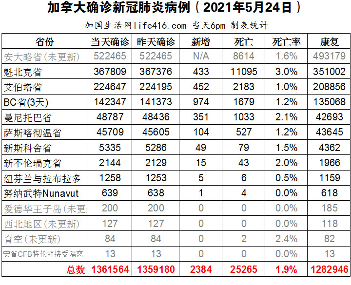 【加国生活网编译报道】截至2021年5月24日下午6点,加拿大新冠确诊病例总数为1361564(3天新增2384),死亡25265(新增34)。安省逢公众假期未更新;魁省确诊总数367809(新增433);艾省确诊总数224647(新增452);BC省确诊总数142347(3天新增974);曼省确诊总数48787(新增351);萨省确诊总数45709(新增104)。加拿大已有好几个省份将疫苗适用范围扩大到了12岁以上的青少年;BC省疫情降至六个月以来的最低点,B首席卫生官和卫生部长Adrian Dix感谢省民所付出的努力和决心;魁省创自9月19日以来单日新增确诊病例最少记录;纽芬兰和拉布拉多疫情爆发,昨日新增23例。加国生活网专门制作了如下统计数据表: