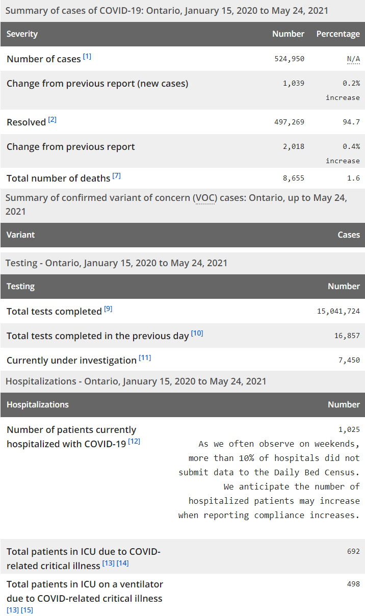 再看看安省方面的详细数据,截止5月24日,安省已对15,041,724例进行了新冠病毒检测(检测数较昨天新增16,857),还有7,450处于被调查阶段。确诊总数524,950(当天新增1,039,阳性率上升至6.16%),包括497,269例康复(康复率上升为94.7%)、8,655例死亡(增加41例,死亡率仍为1.6%)。住院患者1,025例(减少16,长周末有10%医院未提交数据);进入ICU患者692例(减少1);IU插呼吸机患者498例(增加18)。