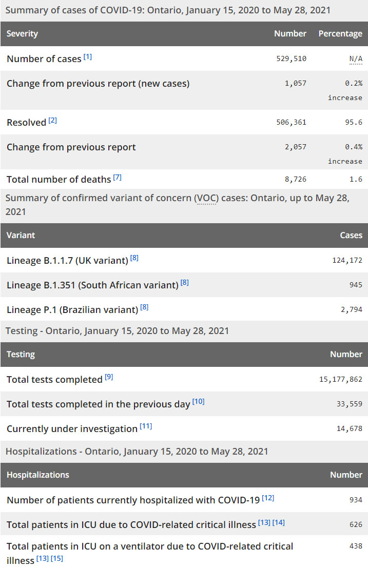 再看看安省方面的详细数据,截止5月28日,安省已对15,177,862例进行了新冠病毒检测(检测数较昨天新增33,559),还有14,678处于被调查阶段。确诊总数529,510(当天新增1,057,阳性率上升至3.15%),包括506,361例康复(康复率上升为95.6%)、8,726例死亡(增加15例,死亡率仍为1.6%)。住院患者934例(减少89);进入ICU患者626例(减少19);IU插呼吸机患者438例(减少20)。