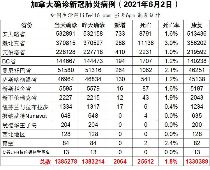【加国生活网编译报道】截至2021年6月2日下午6点,加拿大新冠确诊病例总数为1385278(新增2064),死亡25612(新增45)。安省确诊总数532891(新增733);魁省确诊总数370815(新增288);艾省确诊总数228128(新增410);BC省确诊总数144667(新增194);曼省确诊总数51580(新增264);萨省确诊总数46964(新增130)。安省新增733例确诊病例,连续第三天低于1千例以下;安省省长福特宣布,安省学生不会在9月之前重返课堂学习;纽芬兰和拉布拉多省准备在今年夏天欢迎接种2剂疫苗的加拿大人;以色列卫生部发现年轻男性中出现少数心肌炎病例可能与辉瑞疫苗接种有关,加拿大卫生部则表示未发现加拿大心肌炎发病率高于一般人群的预期。加国生活网专门制作了如下统计数据表: