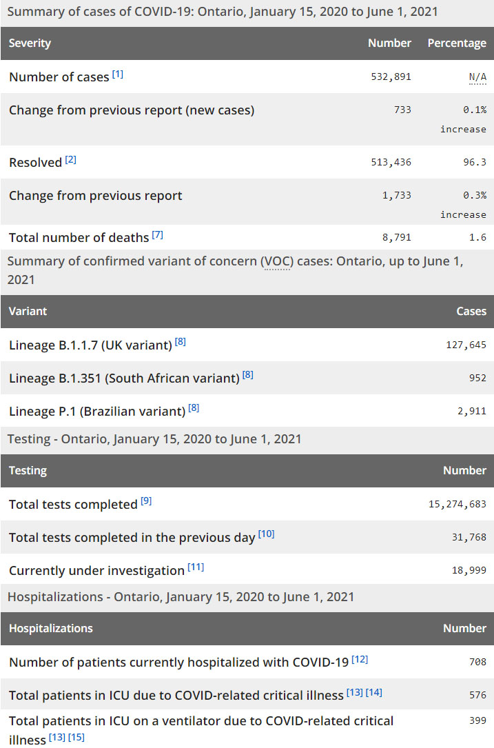 再看看安省方面的详细数据,截止6月1日,安省已对15,274,683例进行了新冠病毒检测(检测数较昨天新增31,768),还有18,999处于被调查阶段。确诊总数532,891(当天新增733,阳性率下降至2.31%),包括513,436例康复(康复率上升为96.3%)、8,791例死亡(增加25例,死亡率仍为1.6%)。住院患者708例(减少96);进入ICU患者576例(减少7);IU插呼吸机患者399例(增加12)。