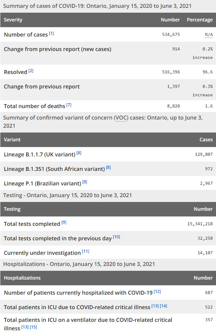 再看看安省方面的详细数据,截止6月3日,安省已对15,341,281例进行了新冠病毒检测(检测数较昨天新增32,258),还有14,107处于被调查阶段。确诊总数534,675(当天新增914,阳性率上升至2.83%),包括516,396例康复(康复率上升为96.6%)、8,820例死亡(增加19例,死亡率仍为1.6%)。住院患者687例(减少42);进入ICU患者522例(减少24);IU插呼吸机患者357例(减少13)。