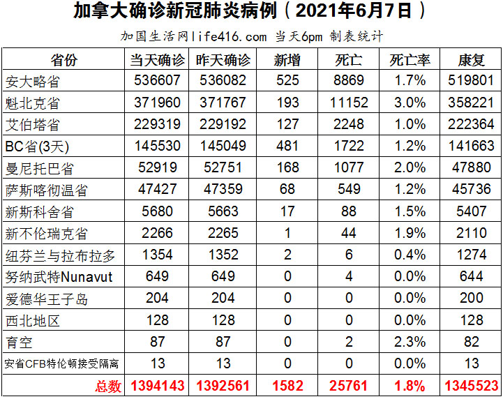 【加国生活网编译报道】截至2021年6月7日下午6点,加拿大新冠确诊病例总数为1394143(3天新增1582,当天新增1234),死亡25761(3天新增36)。安省确诊总数536607(新增525);魁省确诊总数371960(新增193);艾省确诊总数229319(新增127);BC省确诊总数145530(3天新增481,当天新增133);曼省确诊总数52919(新增168);萨省确诊总数47427(新增68)。Moderna公司正在寻求加拿大卫生部的授权,允许其疫苗用于青少年;BC省周末三天共新增了481例确诊病例,7天的日均病例数达到177,创10月20日以来的最低水平;安省新增525例确诊病例,创自2020年9月下旬以来的最少病例;安省将提前三天(从6月11日星期五12:01am起)进入重新开放计划的第一阶段。加国生活网专门制作了如下统计数据表: