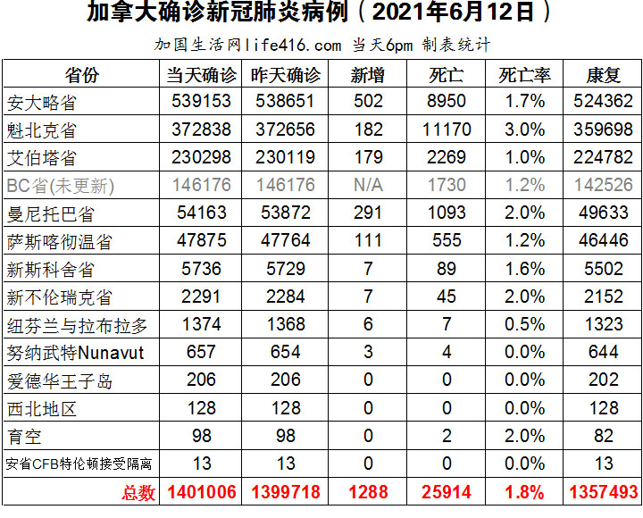 【加国生活网编译报道】截至2021年6月12日下午6点,加拿大新冠确诊病例总数为1401006(新增1288),死亡25914(新增28)。安省确诊总数539153(新增502);魁省确诊总数372838(新增182);艾省确诊总数230298(新增179);BC省逢周末不更新;曼省确诊总数54163(新增291);萨省确诊总数47875(新增111)。英国的早期数据和BC省刚刚发布的一项新研究均指出抵抗变异病毒并让加拿大永久重启的最佳途径——尽快让尽可能多的人接种疫苗;安省连续第三天超过500例;安省将AstraZeneca疫苗的第一剂和第二剂之间的等待时间从12周缩短至8周。加国生活网专门制作了如下统计数据表: