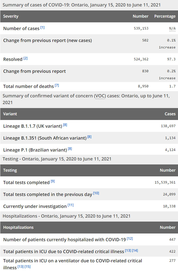 再看看安省方面的详细数据,截止6月11日,安省已对15,539,361例进行了新冠病毒检测(检测数较昨天新增24,099),还有10,338处于被调查阶段。确诊总数539,153(当天新增502,阳性率上升至2.08%),包括524,362例康复(康复率上升为97.3%)、8,950例死亡(增加15例,死亡率仍为1.7%)。住院患者447例(减少42);进入ICU患者422例(减少18);IU插呼吸机患者277例(减少15)。