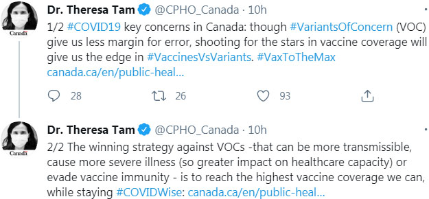 —— 随着越来越多令人担忧的变异病毒在全国范围内爆发,加拿大首席公共卫生官Theresa Tam博士再次在Twitter上发文称新冠疫苗是对抗变异病毒的主要武器,“虽然变异病毒引发的确诊病例让我们不能有再犯错的余地,但我们只要尽可能达到所能达到的最高疫苗覆盖率就一定会给我们带来更多的优势。”