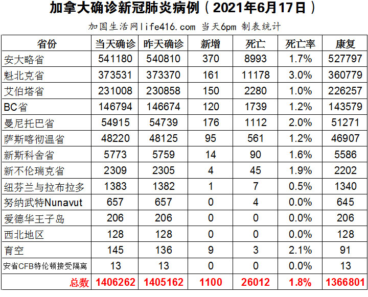 【加国生活网编译报道】截至2021年6月17日下午6点,加拿大新冠确诊病例总数为1406262(新增1100),死亡26001(新增11)。安省确诊总数541180(新增370);魁省确诊总数373531(新增161);艾省确诊总数231008(新增150);BC省确诊总数146794(新增120);曼省确诊总数54915(新增176);萨省确诊总数48220(新增95)。国家免疫咨询委员会建议加拿大各省和地区在大多数情况下停止接种AstraZeneca疫苗;安省连续第二天接种了超过20万剂疫苗;多伦多大学医院网络(UHN)重症监护ICU病房患者首次清零;安省将在未来几周内增加更多第二剂疫苗的预约时间,18岁以上省民6月28日均可预约第二剂;多伦多从6月17日起开设十多家流动疫苗接种诊所;BC省计划在9月份让所有孩子都能全日制上学。加国生活网专门制作了如下统计数据表: