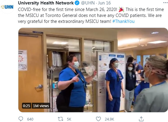 安省最繁忙的多伦多综合医院——多伦多大学医院网络(UHN)在6月16日宣布,重症监护ICU病房里的新冠患者清零了!这是自2020年3月26日以来首次COVID Free。Christine Elliott说:“正如你想象的那样,这对他们来说是一个非常激动人心的时刻。”(视频请点击这里观看)