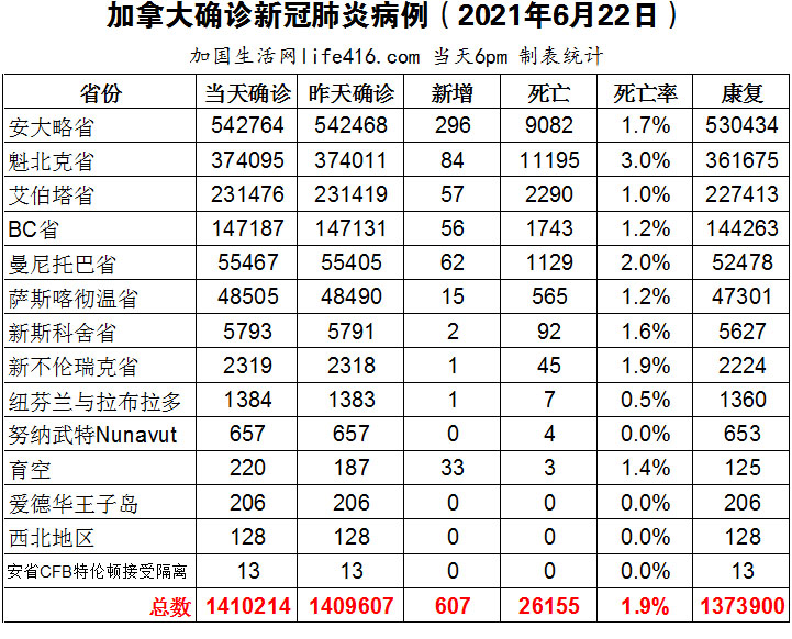 【加国生活网编译报道】截至2021年6月22日下午6点,加拿大新冠确诊病例总数为1410214(新增607),死亡26155(新增68)。安省确诊总数542764(新增296);魁省确诊总数374095(新增84);艾省确诊总数231476(新增57);BC省确诊总数147187(新增56);曼省确诊总数55467(新增62);萨省确诊总数48505(新增15)。完全接种2剂疫苗后什么可以做?能拥抱吗?能室内聚会吗?能摘口罩吗?专家提醒第二剂疫苗接种两周后才达到最佳预防效果;Delta变异病毒现在已占安省所有新病例的50%以上;虽然安省已达到第三阶段的解封标准,但省府对重启依然格外谨慎。加国生活网专门制作了如下统计数据表: