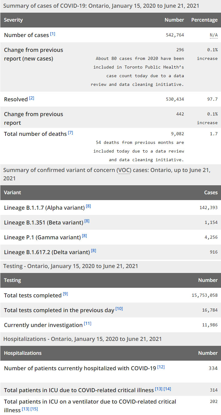 再看看安省方面的详细数据,截止6月21日,安省已对15,753,058例进行了新冠病毒检测(检测数较昨天新增16,784),还有11,986处于被调查阶段。确诊总数542,764(当天新增296,阳性率下降至1.76%。由于数据审查和清理计划,增加了多伦多公共卫生局在2020年遗漏的大约80例病例),包括530,434例康复(康复率仍为97.7%)、9,082例死亡(增加60例,死亡率仍为1.7%。由于数据审查和清理计划,今天包括了前几个月遗漏的54例死亡病例)。住院患者334例(增加73);进入ICU患者314例(减少9);IU插呼吸机患者202例(未变)。
