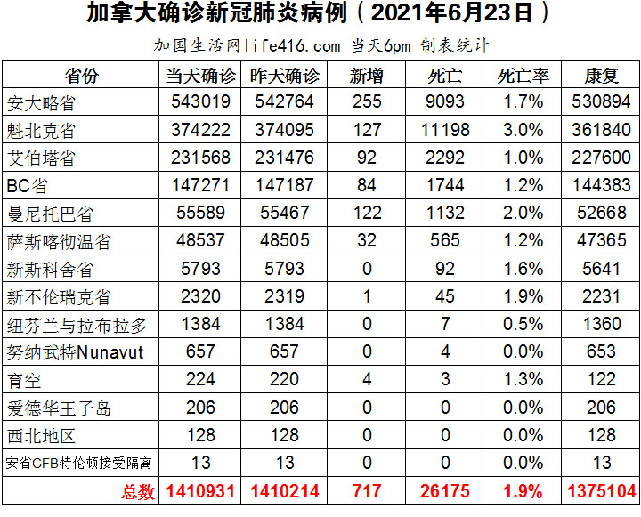 【加国生活网编译报道】截至2021年6月23日下午6点,加拿大新冠确诊病例总数为1410931(新增717),死亡26175(新增20)。安省确诊总数543019(新增255);魁省确诊总数374222(新增127);艾省确诊总数231568(新增92);BC省确诊总数147271(新增84);曼省确诊总数55589(新增122);萨省确诊总数48537(新增32)。安省连续第三天新增病例少于300例,有望提前2天即6月30日进入重新开放计划的第2阶段;安省76.5%已接种1剂疫苗、近26%已接种2剂疫苗,已超过第3阶段重启阈值; 多伦多将在6月27日与TTC和Metrolinx合作,提供往返疫苗接种诊所的免费乘车服务。加国生活网专门制作了如下统计数据表: