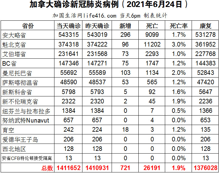 【加国生活网编译报道】截至2021年6月24日下午6点,加拿大新冠确诊病例总数为1411652(新增721),死亡26191(新增16)。安省确诊总数543315(新增296);魁省确诊总数374318(新增96);艾省确诊总数231641(新增73);BC省确诊总数147346(新增75);曼省确诊总数55692(新增103);萨省确诊总数48590(新增53)。安省新增296例确诊病例,连续第4天确诊病例少于300例;即将退休的安省首席卫生官David Williams博士宣布安省将于6月30日进入重启第二阶段,但不包括滑铁卢区。Delta变异病毒确诊病例持续上升至63%,这也是安省没有直接进入第3步的主要原因;约克区在6月25日上午8点将开放约38,000个疫苗预约名额。加国生活网专门制作了如下统计数据表: