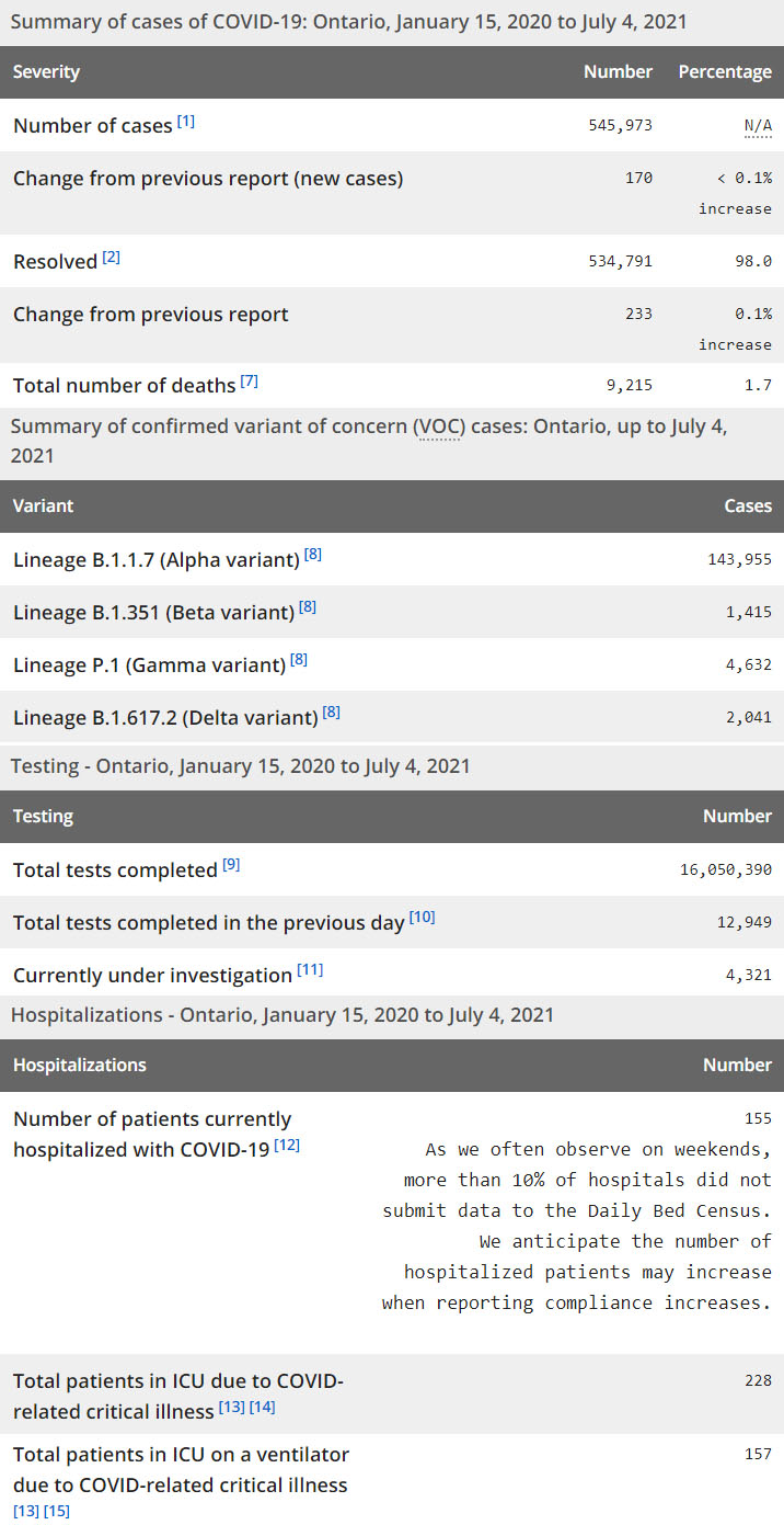 再看看安省方面的详细数据,截止7月4日,安省已对16,050,390例进行了新冠病毒检测(检测数较昨天新增12,949),还有4,321处于被调查阶段。确诊总数545,973(当天新增170,阳性率上升至1.31%),包括534,791例康复(康复率上升为98%)、9,215例死亡(增加1例,死亡率仍为1.7%)。住院患者155例(减少3,周末有10%医院未提交数据);进入ICU患者228例(减少7);IU插呼吸机患者157例(减少2)。