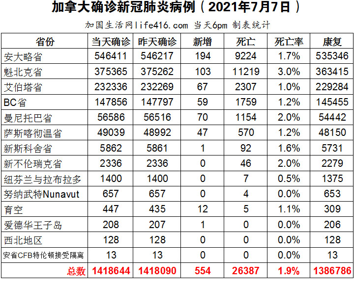 【加国生活网编译报道】截至2021年7月7日下午6点,加拿大新冠确诊病例总数为1418644(新增554),死亡26387(新增6)。安省确诊总数546411(新增194);魁省确诊总数375365(新增103);艾省确诊总数232336(新增67);BC省确诊总数147856(新增59);曼省确诊总数56586(新增70);萨省确诊总数49039(新增47)。专家警告称更具传染性的Delta变异病毒仍会感染那些尚未接种疫苗的人并引发疫情;超过一半的新冠确诊患者可能会一直持续出现“新冠后综合症”长达三个多月;安省在7月7日当天创自9个月以来首次零死亡病例;安省公布接种疫苗后阳性率报告,一剂0.16%、二剂0.02%。加国生活网专门制作了如下统计数据表: