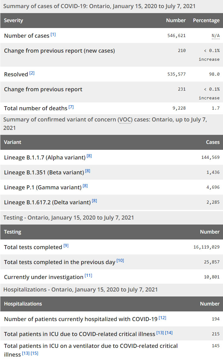 再看看安省方面的详细数据,截止7月7日,安省已对16,119,029例进行了新冠病毒检测(检测数较昨天新增25,857),还有10,801处于被调查阶段。确诊总数546,621(当天新增210;阳性率上升至0.81%),包括535,577例康复(康复率仍为98%)、9,228例死亡(新增4例,死亡率仍为1.7%)。住院患者194例(减少7);进入ICU患者215例(减少5);IU插呼吸机患者145例(减少10)。