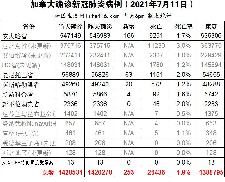 【加国生活网编译报道】截至2021年7月11日下午6点,加拿大新冠确诊病例总数为1420531(新增253),死亡26436(新增8)。安省确诊总数547149(新增166);魁省、艾省、BC省逢周末不更新;曼省确诊总数56889(新增63);萨省确诊总数49260(新增20)。自加拿大边境放宽限制以来,入境人数增加了约25%,仍有大约一半人不符合免隔离要求,被拒绝豁免的人中,大多数人要么只接种了一剂疫苗、要么在接种第二剂后没有等待14天、要么接种了未获准在加拿大使用的疫苗;安省新增166例,创自2020年9月9日以来单日病例数最少的一天。加国生活网专门制作了如下统计数据表: