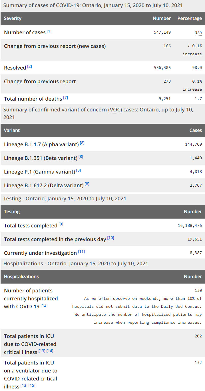 再看看安省方面的详细数据,截止7月10日,安省已对16,188,476例进行了新冠病毒检测(检测数较昨天新增19,651),还有8,387处于被调查阶段。确诊总数547,149(当天新增166;阳性率上升至0.84%),包括536,306例康复(康复率仍为98%)、9,251例死亡(新增6例,死亡率仍为1.7%)。住院患者130例(减少35,有10%医院周末没有上传数据);进入ICU患者202例(增加5);IU插呼吸机患者132例(减少2)。
