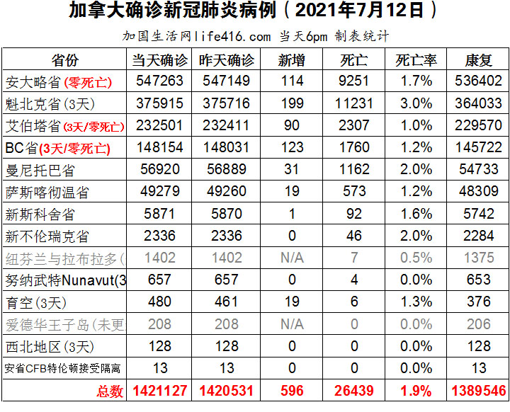【加国生活网编译报道】截至2021年7月12日下午6点,加拿大新冠确诊病例总数为1421127(3天新增596,当天新增296),死亡26439(新增3)。安省确诊总数547263(新增114);魁省确诊总数375915(3天新增199,当天新增52)、艾省确诊总数232501(3天新增90,当天新增30)、BC省确诊总数148154(3天新增123,当天新增30);曼省确诊总数56920(新增31);萨省确诊总数49279(新增19);育空确诊总数480(3天新增19)。BC省、艾省、安省和魁省均创零死亡记录,整个加拿大周末仅新增3例死亡病例;从7月12日起,魁省放宽了一些卫生限制措施,比如来自不同地址的人之间必须保持一米而不是两米的强制性距离,这将适用于室内和室外。加国生活网专门制作了如下统计数据表: