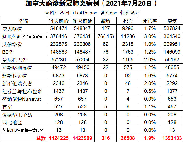 【加国生活网编译报道】截至2021年7月20日下午6点,加拿大新冠确诊病例总数为1423909(新增316),死亡26508(新增4)。安省确诊总数548474(新增127);魁省确诊总数376416(当天新增76,系统更新减少91例后为-15例)、艾省确诊总数232875(新增69)、BC省确诊总数148563(新增76);曼省确诊总数57236(新增32);萨省确诊总数49472(新增22)。BC省新增病例的7天滚动平均值过去几周一直在缓慢上升;安省目前仍有超过250万符合条件的省民未接种疫苗;约克区8个疫苗诊所将不需要预约即可接种第一剂和第二剂疫苗,辉瑞和Moderna疫苗均有。加国生活网专门制作了如下统计数据表: