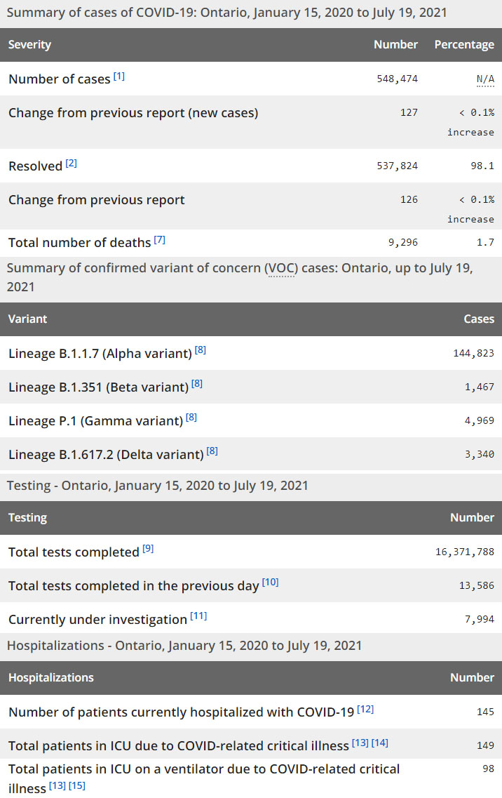 再看看安省方面的详细数据,截止7月19日,安省已对16,371,788例进行了新冠病毒检测(检测数较昨天新增13,586),还有7,994处于被调查阶段。确诊总数548,474(当天新增127;阳性率下降至0.93%),包括537,824例康复(康复率仍为98.1%)、9,296例死亡(新增2例,死亡率仍为1.7%)。住院患者145例(增加30);进入ICU患者149例(减少2);IU插呼吸机患者98例(增加4)。