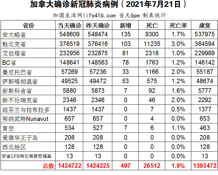 【加国生活网编译报道】截至2021年7月21日下午6点,加拿大新冠确诊病例总数为1424722(新增497),死亡26512(新增4)。安省确诊总数548609(新增135);魁省确诊总数376519(新增103)、艾省确诊总数232956(新增81)、BC省确诊总数148641(新增78);曼省确诊总数57269(新增33);萨省确诊总数49525(新增53)。美国将与加拿大和墨西哥之间的陆路和渡轮过境点的非必要旅行的限制延长至8月21日;由于加拿大疫苗接种率下降,专家警告未接种疫苗的人是在浪费身体建立足够免疫力所需的时间;安省卫生官准备把重启最后一步门槛提高到90%接种两剂疫苗;皮尔区准备让12至17岁青少年达到100%的疫苗覆盖率。加国生活网专门制作了如下统计数据表: