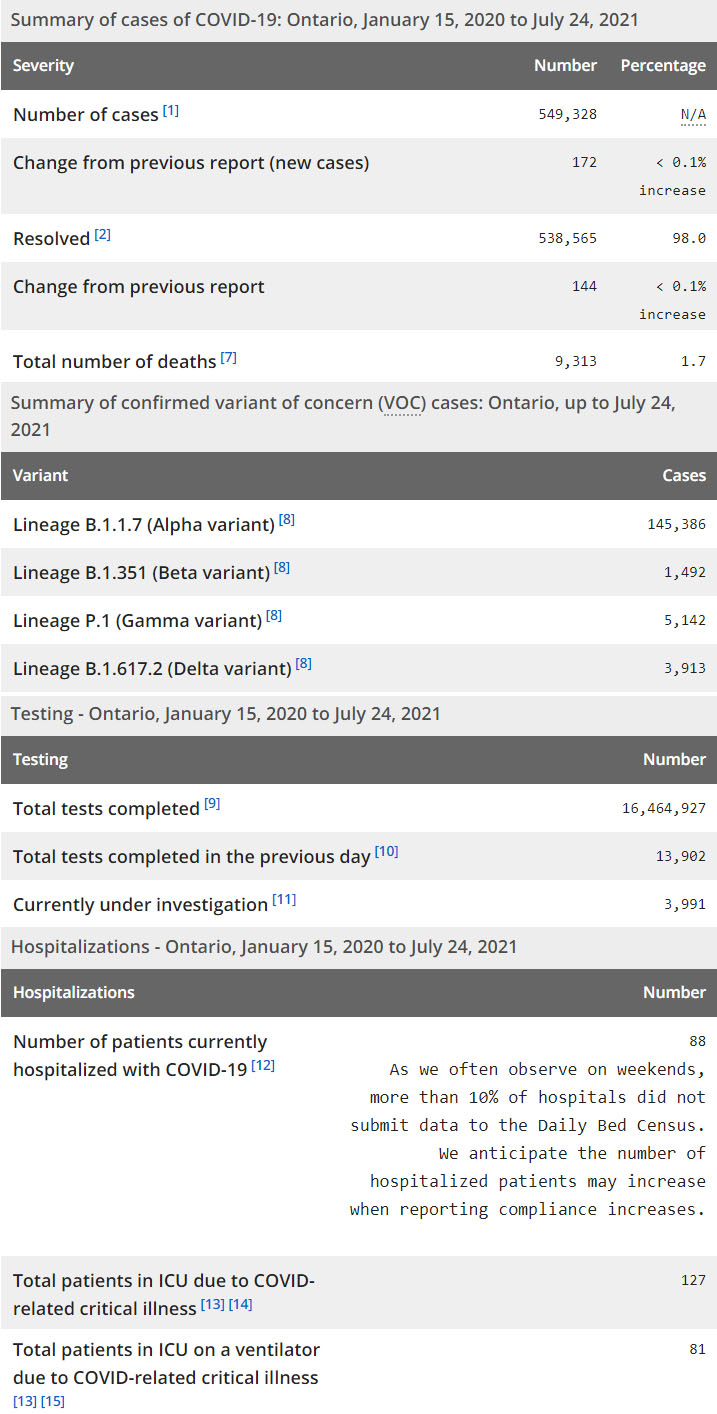 再看看安省方面的详细数据,截止7月24日,安省已对16,464,927例进行了新冠病毒检测(检测数较昨天新增13,902),还有3,991处于被调查阶段。确诊总数549,328(当天新增172;阳性率上升至1.24%),包括538,565例康复(康复率仍为98.0%)、9,313例死亡(新增2例,死亡率仍为1.7%)。住院患者88例(减少37,周末有10%医院未更新数据);进入ICU患者127例(减少5);IU插呼吸机患者81例(减少5)。