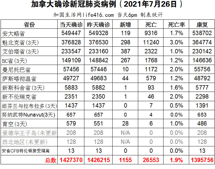 【加国生活网编译报道】截至2021年7月26日下午6点,加拿大新冠确诊病例总数为1427370(3天新增1155,当天新增514),死亡26553(新增6)。安省确诊总数549447(新增119);魁省确诊总数376828(3天新增298,当天新增75)、艾省确诊总数233547(3天新增387,当天新增94)、BC省确诊总数149109(3天新增267,当天新增94);曼省确诊总数57456(新增10);萨省确诊总数49727(新增44);育空确诊总数522(3天新增28)。魁省政府表示,已完全接种AstraZeneca疫苗的省民可以在旅行前接种第三剂mRNA疫苗,以满足某些国家的疫苗接种要求;BC省每日新增病例的7天滚动平均值在三周内增加了154%;安省的新增病例中绝大多数是年轻人。加国生活网专门制作了如下统计数据表: