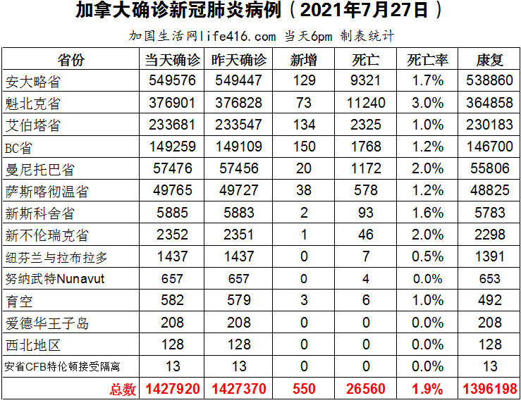 【加国生活网编译报道】截至2021年7月27日下午6点,加拿大新冠确诊病例总数为1427920(新增550),死亡26560(新增7)。安省确诊总数549576(新增129);魁省确诊总数376901(新增73)、艾省确诊总数233681(新增134)、BC省确诊总数149259(新增150);曼省确诊总数57476(新增20);萨省确诊总数49765(新增38)。加拿大总理特鲁多表示本周即将到来500万剂疫苗将使加拿大疫苗总数超过6600万这一里程碑,足够让所有3320万12岁及以上的加拿大人接种疫苗;安省已要求联邦政府确保随着边境措施的解除,接受混种疫苗的加拿大人被允许进行国际旅行;美国疾病控制与预防中心宣布已接种完疫苗的美国人应该重新在室内公共场所戴口罩。加国生活网专门制作了如下统计数据表: