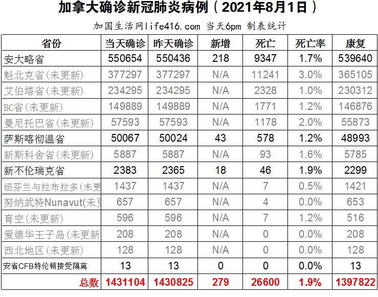 【加国生活网编译报道】截至2021年8月1日下午6点,加拿大新冠确诊病例总数为1431104(新增279),死亡26600(新增2)。安省确诊总数550654(新增218);萨省确诊总数50067(新增43);其余省份在周末都未更新。虽然加拿大混种疫苗的模式一直存在争议,但随着供应延迟和某些与疫苗相关的安全问题,越来越多的国家正在考虑将不同的疫苗作为第二剂或加强剂纳入其疫苗接种计划;安省每日新增确诊病例连续第四天超过200例;安省药剂师协会称一些莫德纳疫苗即将在八月初过期,希望还没有接种疫苗的人尽快来接种疫苗。加国生活网专门制作了如下统计数据表: