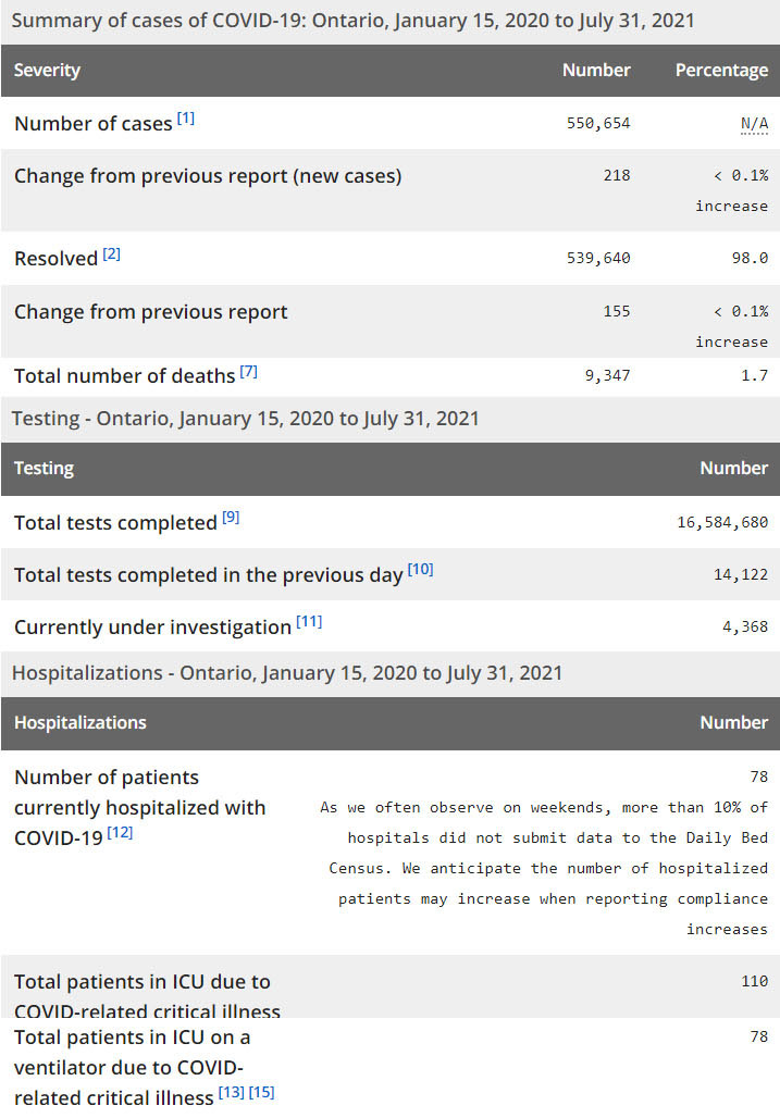再看看安省方面的详细数据,截止7月31日,安省已对16,584,680例进行了新冠病毒检测(检测数较昨天新增14,122),还有4,368处于被调查阶段。确诊总数550,654(当天新增218;阳性率上升至1.54%),包括539,640例康复(康复率仍为98.0%)、9,347例死亡(新增2例,死亡率仍为1.7%)。住院患者78例(减少27,有10%医院周末没有提交数据);进入ICU患者110例(减少2);IU插呼吸机患者78例(减少5)。