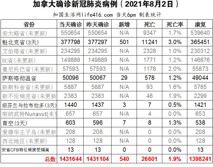 由于好多省份在Civic Holiday假期没有更新数据,加国生活网小编制作的曲线图也在周末暂停,等周二发布更新数据后,小编会根据最新数据制作图表。