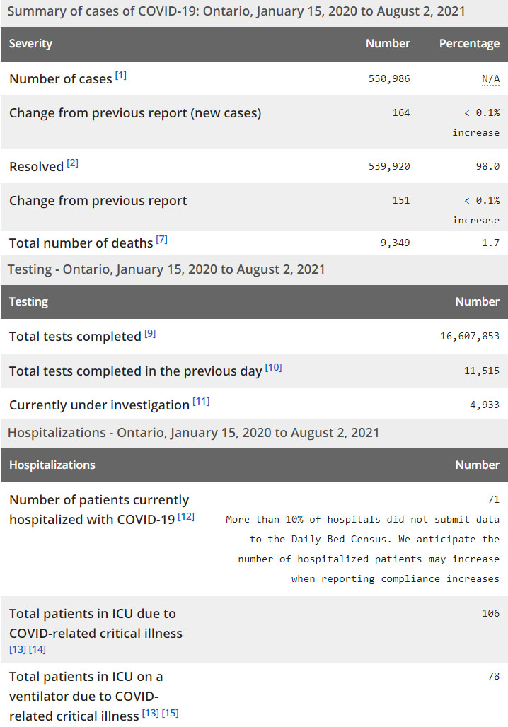再看看安省方面的详细数据,截止8月2日,安省已对16,607,853例进行了新冠病毒检测(检测数较昨天新增11,515),还有4,933处于被调查阶段。确诊总数550,986(当天新增164;阳性率下降至1.42%),包括539,920例康复(康复率仍为98.0%)、9,349例死亡(新增2例,死亡率仍为1.7%)。住院患者71例(减少7,有10%医院周末没有提交数据);进入ICU患者106例(减少4);IU插呼吸机患者78例(未变)。