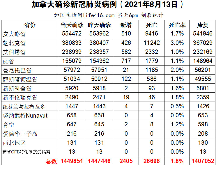 【加国生活网编译报道】截至2021年8月13日下午6点,加拿大新冠确诊病例总数为1449851(新增2405),死亡26698(新增6)。安省确诊总数554472(新增510);魁省确诊总数380833(新增426)、艾省确诊总数238939(新增582)、BC省确诊总数155079(新增717);曼省确诊总数57972(新增21);萨省确诊总数51034(新增122)。加拿大交通部长宣布联邦政府将很快要求所有公务员接种疫苗,在未来几周内,其他受联邦监管的企业也将实施这项要求;BC省新增717例确诊病例;安省新增510例确诊病例,连续第二天单日新增超过500例。加国生活网专门制作了如下统计数据表: