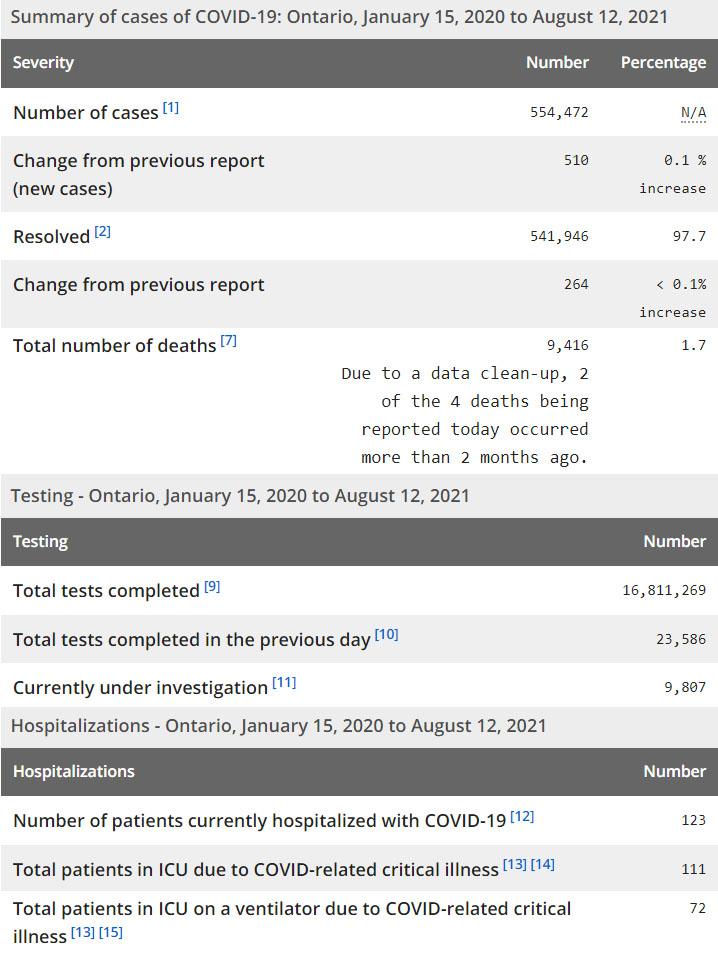 再看看安省方面的详细数据,截止8月12日,安省已对16,811,269例进行了新冠病毒检测(检测数较昨天新增23,586),还有9,807处于被调查阶段。确诊总数554,472(当天新增510;阳性率下降至2.16%),包括541,946例康复(康复率下降为97.7%)、9,416例死亡(新增4例,其中2例为历史遗漏数据,死亡率仍为1.7%)。住院患者123例(增加7);进入ICU患者111例(减少2);IU插呼吸机患者72例(减少4)。